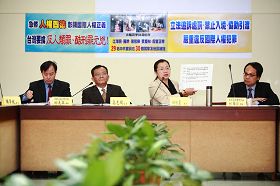 ![]() 图1:“彰显国际人权正义 台湾要擒‘反人类罪’、‘酷刑罪’元凶”记者会。出席者包括立委田秋堇(右二)、前台权会长邱晃泉(左一)、民间司改会执行长林峰正(右一)、立委高志鹏等人。 |