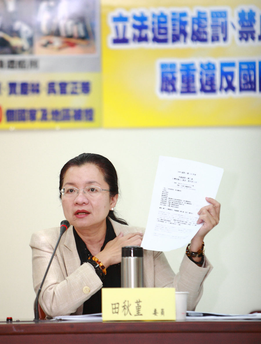立法委员田秋堇在记者会上列举实证,揭露中共迫害法轮功学员的罪行:台湾九十岁老人家李善桢的女儿李燿华(六十三岁,香港籍)和外孙女张轶博因为在上海发三十张法轮功简介,半夜同时被绑架,失踪达五个月之久。在偌大的上海找不到一位律师敢为她们辩护,后来必须远赴北京才找到一位维权律师帮忙。