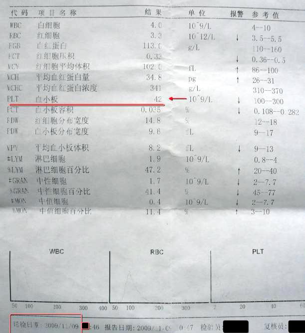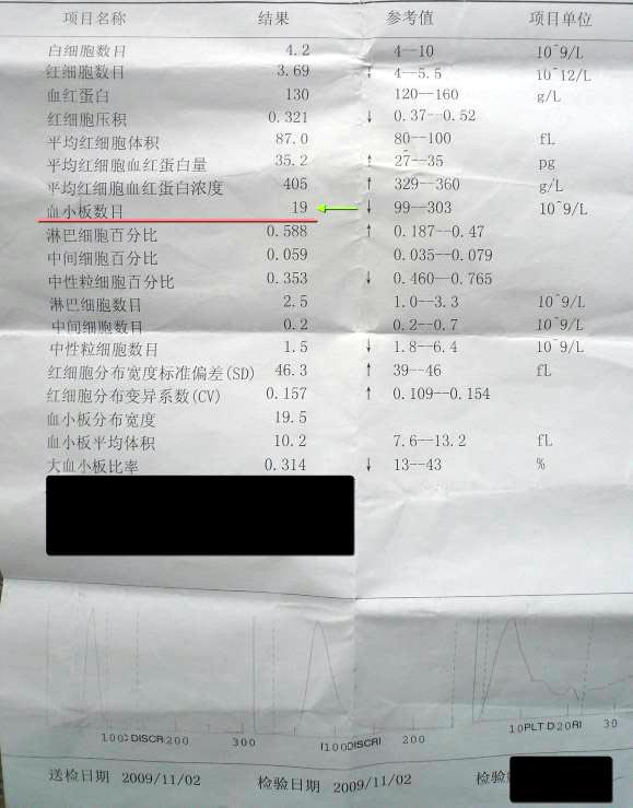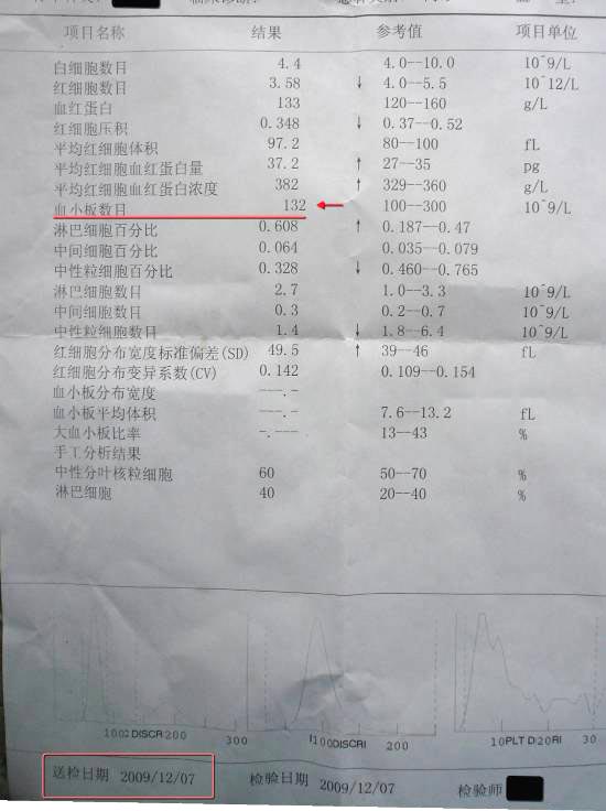 在2009年11月02日检测血小板仅为19×109/L的情况下,博士生开始认真看《转法轮》,开始修炼法轮功。坚持两周后,血小板增长到了42×109/L,又过了三个星期,血小板增加到了132×109/L,达到正常值。