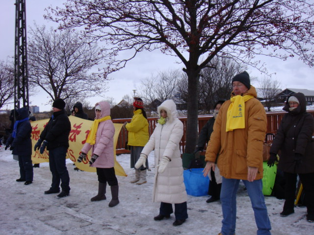![]() 严寒中,法轮功学员呼吁人们关注发生在中国的迫害。 |