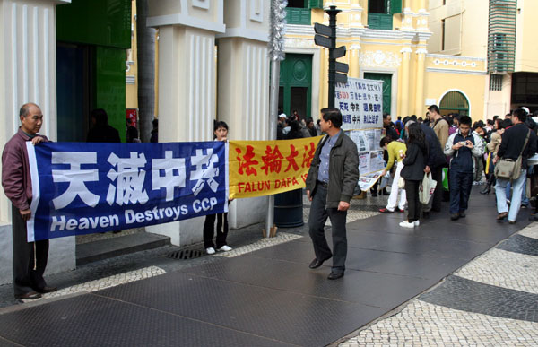 澳门法轮功学员打出“法轮大法好”,“法轮大法、真善忍”及“解体中共 停止迫害”等横幅。“玫瑰堂前地”大陆游客众多,当学员摆放横幅时,已有大批大陆游客围观,当横幅及真相图片打开后,游客纷纷取出照相机拍照,及主动向学员取阅真相资料。