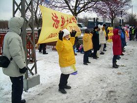 ![]() 法轮功学员在贝拉会议中心外炼功 |