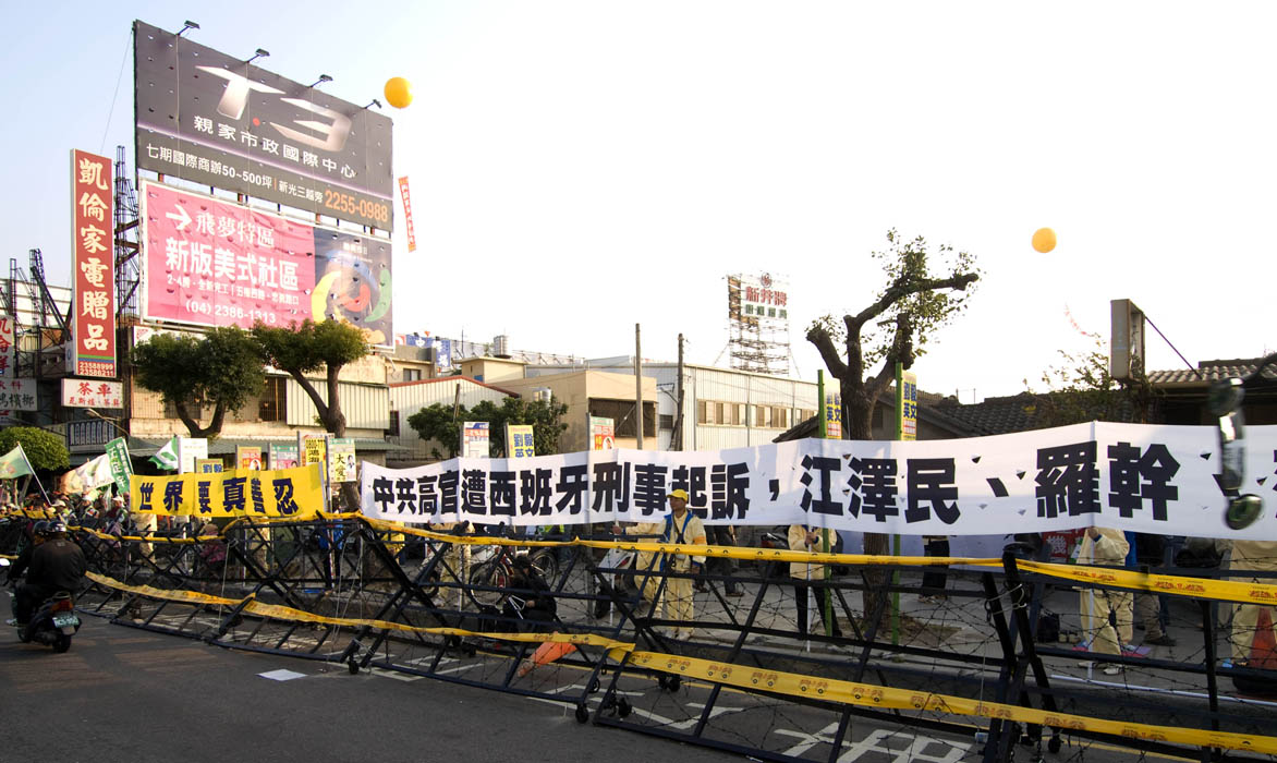 从二十日起,法轮功学员在江陈会场外周边道路上,拉起了“法轮大法好”、“中共高官遭西班牙刑事起诉 江泽民、罗干、薄熙来、贾庆林、吴官正”等约三百五十条巨型横幅,绵延数公里。在十度低温下,从上午四时至晚间十二时,学员们坚持拉着横幅、静坐,令参与江陈会的六百位中外媒体人及六千名警察肃然起敬。
