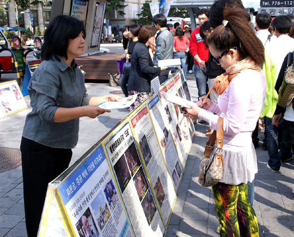 两年前的十二月份,韩国国家情报局的一名职员与妻子路过此处,看了展板内容后直接签名制止迫害,并表示,这样的事情不应该发生。他还讲了一段不为人知的内情,他说去中国留学的韩国学生也有被害案例,虽然韩国的媒体有时也有报道,但是他们只报道表面的死亡案例,比如是自杀或者是他杀,实质的东西并没有透露出来。实际上这些被害者的内脏器官都已经没有了。