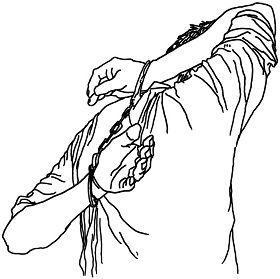 “背剑” 酷刑,一只手从肩上拉向后背,另一只手从腋下向上拉向后背铐一起。通常这种姿式二十分钟便会使人痛苦不堪,但学员常被连续折磨四小时以上。