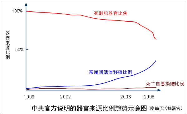 按官方报道,2000-2008年器官来源的比例中,来自亲属间活体移植比例逐年增加,来自死刑犯的器官比例(不是数量)在减少,死亡自愿捐赠的仍然是微乎其微。1999年亲属间活体移植占2%,2004年是4%,[4] 2006年是15%,到了2008-2009年,据《中国日报》引述权威人士说法,有40%来自亲属间活体移植,60%多的器官来自死刑犯,而死亡自愿捐赠的从2003年到2009年只有130人。[5] 大陆《财经》杂志2005年第24期称中国“95%以上的供体是尸体,而尸体几乎全部来自死刑犯。”[6] 《三联生活周刊》2006年4月报导,“中国98%器官移植源控制在非卫生部系统”。[7] 中国肝移植注册网站上列出的1999-2006年肝移植中活体移植的数量远远小于总量 (虽然是不完全统计,但相对比例具有参考价值),也说明活体的比例在2006年前非常小。[8]