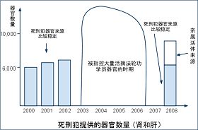 从1999年到2007年,中国器官移植市场飞速发展。在2003年,中国器官移植数量突然大幅度成倍增长。2003到2006年间在国际上掀起了到中国的器官移植旅游热潮。中国一些医院的器官平均等待时间短到不可思议的1-2周 (国外要等2-3年)。哪里来的这么多器官呢?