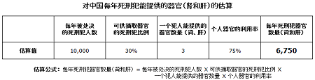 每年死刑犯器官数量(肾和肝) = 每年被处决的死刑犯人数 X 可供摘取器官的死刑犯比例