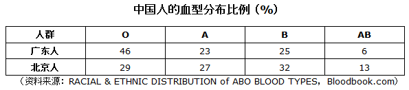 根据上面的数据,可以计算血型完全相同的概率。广东人是33%,北京人是28%。所以,可以大致认为,中国人血型完全匹配的几率在30%左右。