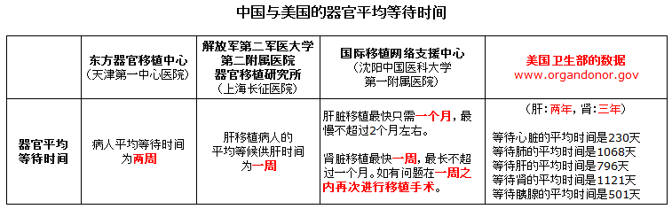 下面列表显示了中国几个大的器官移植中心在2003-2006年期间正式公布的平均器官等待时间,最右边一栏是美国卫生部公布的器官平均等待时间。可以看 出,美国是2-3年,中国是1-2周,天壤之别,可以说是开创了器官移植历史上的一个特大意外。意外的等待时间,就意味着有意外的器官来源。