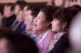 ![]() 朴述女(右二)观看神韵演出时,为之震撼。 |