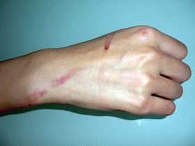据小英回忆,曹章杰手中拿着刚点着的烟指着小英的鼻子骂道:“你是不是还想找打?你再说我就打死你。”说着,一边骂,一边就拿着烟头试图往小英的脸上戳,小英不断的将他的手推开。这时,围过来几个旅行团的客人试图把他拉开。曹章杰一边被拉走一边瞪着眼睛对小英威胁说:“你再说试试,你再说,我就踹死你!”之后,小英拿出随身携带的数码照相机刚对着曹章杰按了一下。“他立刻就冲过来,使劲夺我手上的照相机,狠命扭掐我的手”,小英伸出被抓破的手臂,手背上清晰地留下了被抓出的紫印。