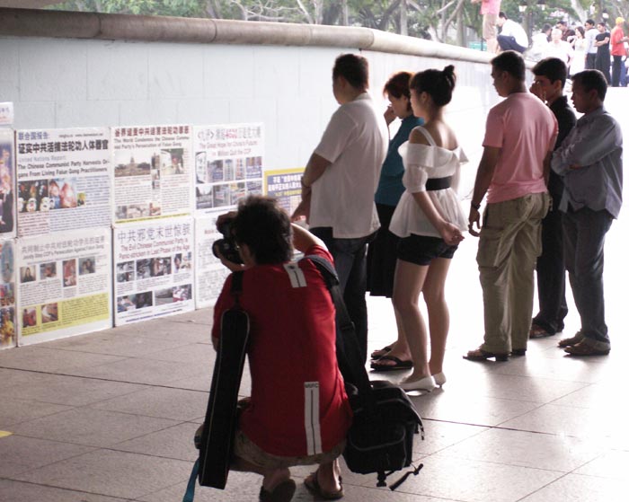 陈先生和太太及一双儿女,在展板前看了很久。作为新加坡人,如果不是今天路过,还真不知道法轮功到底是怎么回事,更不知被迫害的惨烈程度,真是瞠目结舌!陈太太询问了解到,被迫害致死的法轮功学员已经有三千二百四十二人,甚至被活生生开膛破肚,盗取器官时,连声说:“Stop! 必须停止!必须停止!”