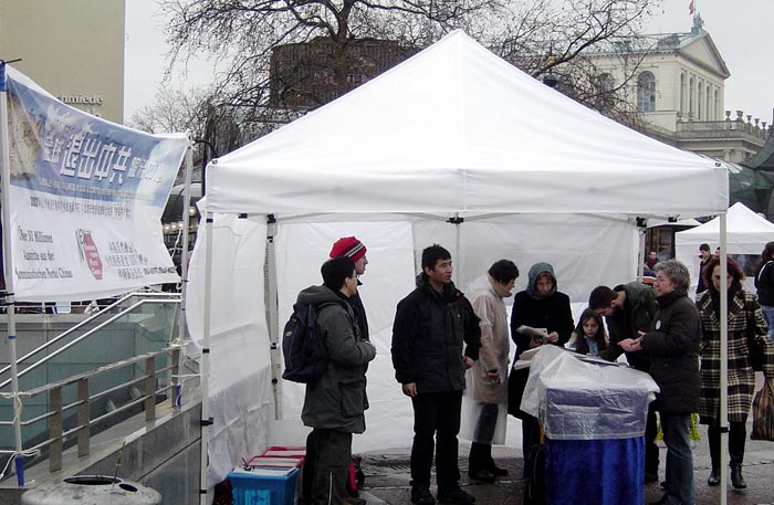 ![]() 七日的汉诺威上午十点半,法轮功学员举办的信息日在寒风和小雨中准时开始。 |