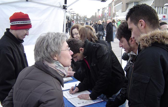 当日上午十点半,天气寒冷,天上还下起了小雨。大约一个小时后,风停雨住,太阳也出来了。过往的行人纷纷走到信息摊位前了解真相。