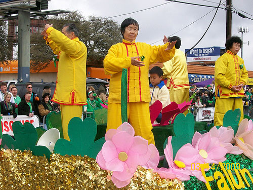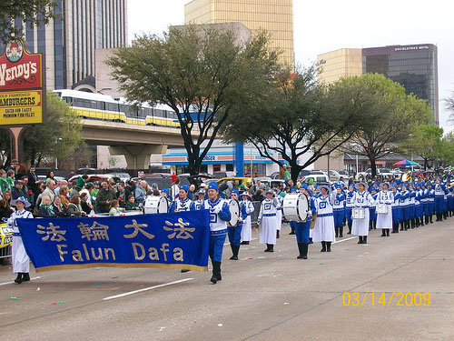 在达拉斯市格林维尔大道上的圣派翠克日大游行起源于一九七九年,今年已是第三十届。法轮功学员在过去的几年来一直参加这个大游行,向人们展示大法的美好和传播福音。