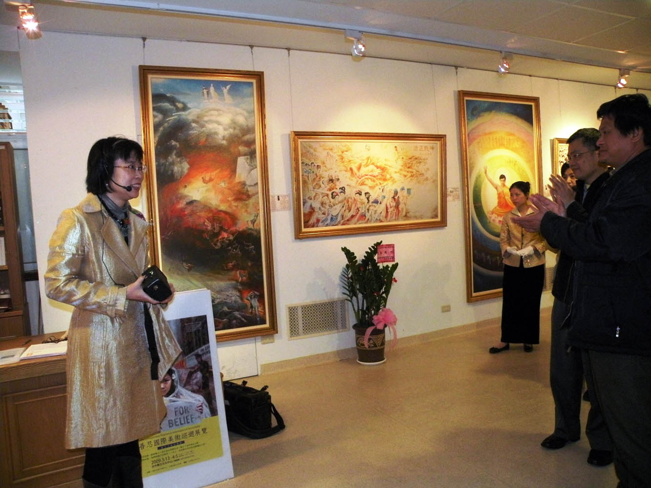 ![]() 三月十四日上午,《真善忍国际美展》在台中县立文化中心开幕。文化中心主任纪镐雄(右二)与台中县清溪文艺学会理事长郭禹君(右一)在画家周怡秀导览解说后,给予画展热情的掌声。 |