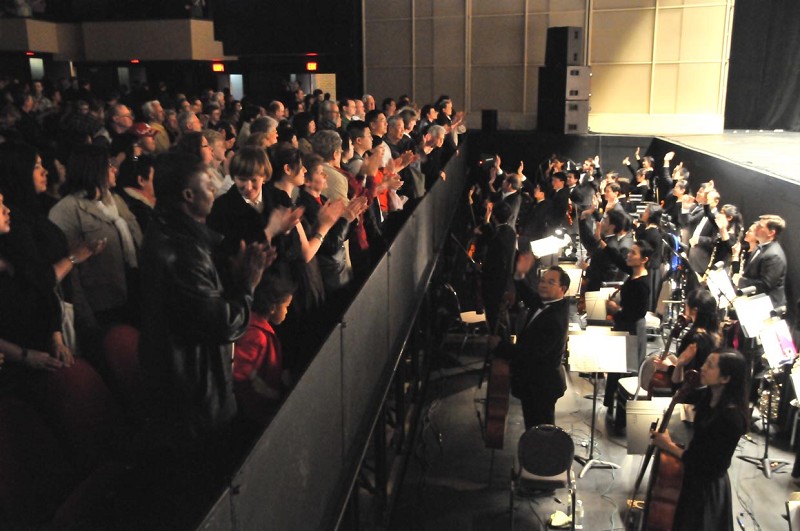 神韵晚会结束时,里贾纳康乃克萨斯艺术中心(Conexus Arts Centre)里掌声雷动,观众纷纷站起来鼓掌。