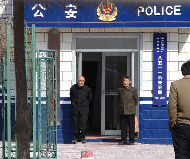 2009年4月5日,牡丹江农垦管理局8511农场公安局,绑架了当地大法弟子姜玉英、宋桂贤。下图是姜玉英年迈的父母在8511农场公安局大门外盼望等待儿女回家时的情景。