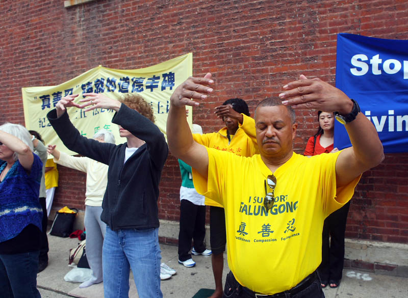 马丁(右一)在芝加哥中领馆前炼功纪念“四•二五”十周年