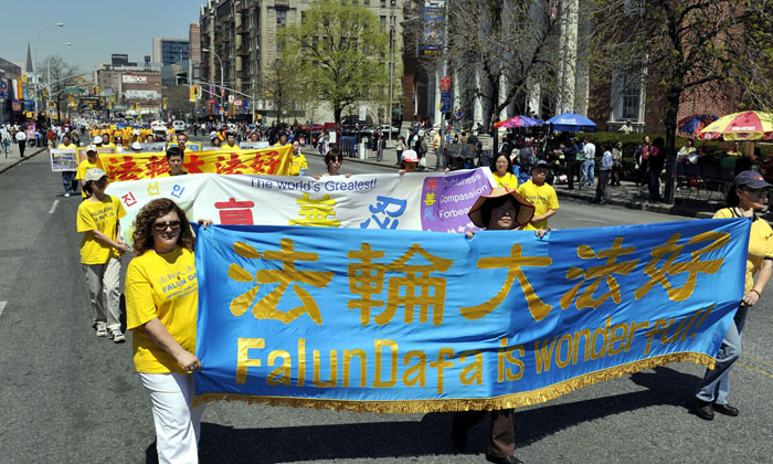 游行以天国乐团开路,分为三个部份:大法洪传,中原蒙难,众生觉醒。星期六的法拉盛,缅街(华人街)上人声鼎沸。游行队伍经过时,人们纷纷驻足观看,并拍照留念。