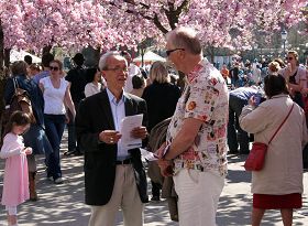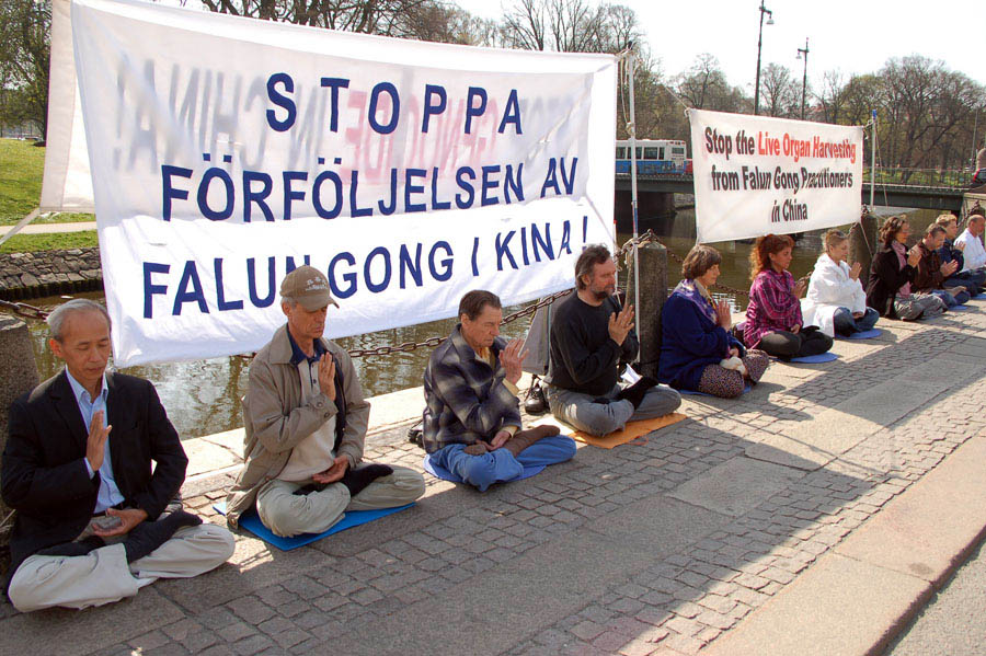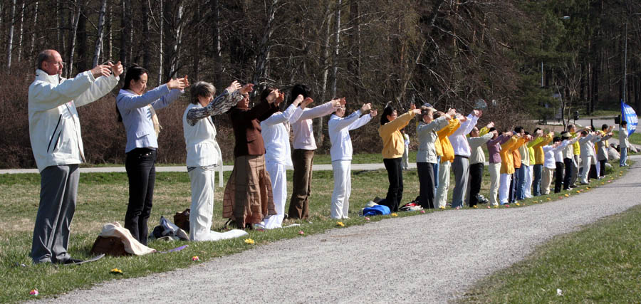 下午法轮功学员又聚集在首都斯德哥尔摩市中心的国王花园(kungstradgarden),拉起横幅、摆出各类真相展板并向游人展示优美祥和的法轮功的五套功法,继续在这里向游人揭露中共迫害法轮功,以及它诬蔑“四•二五”和平上访是“围攻中南海”的欺世谎言,同时把中共迫害法轮功十年来的残忍暴行全部揭露于众。