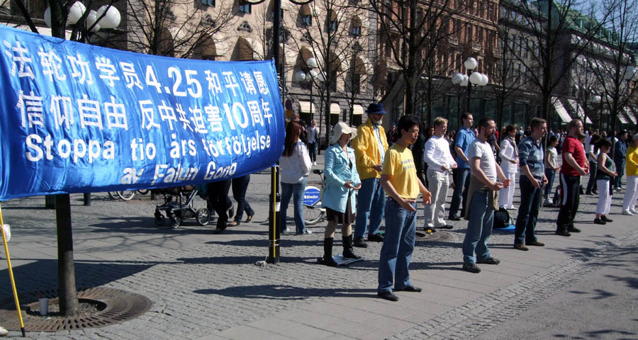 二十五日上午十点整,法轮功学员来到斯德哥尔摩的中使馆对面打出“法轮功学员四•二五和平请愿、信仰自由、反对中共迫害法轮功十周年”等,醒目的中文和瑞典文的横幅,并整齐的站在中使馆前用炼功,抗议中共邪党对法轮功的残酷迫害,并呼吁社会各界共同制止中共继续迫害法轮功。