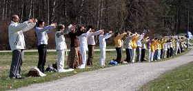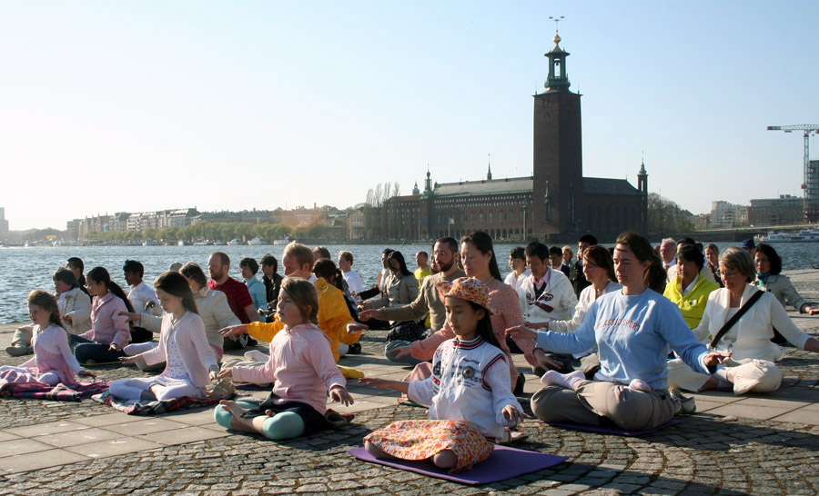 ![]() 纪念“四•二五”和平上访十周年之际,法轮功学员在斯德哥尔摩市政厅前炼功 |