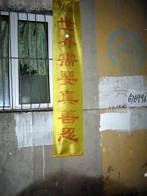 4月24日晚,黑龙江大法弟子为纪念10年前4.25法轮功学员和平大上访,为了让人们了解真相,出外悬挂条幅,条幅上写有“法轮大法好”、“世界需要真善忍”、“天灭中共 退党保命”。