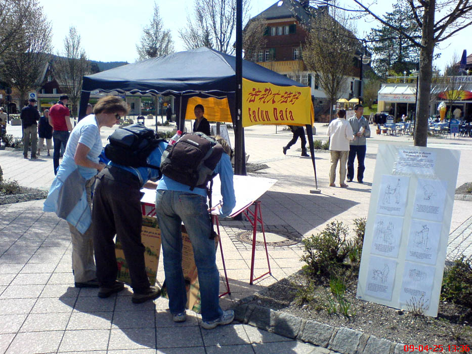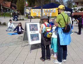 信息台周围,摆放了法轮功学员受中共迫害的多幅展板,其中揭露中共活摘法轮功学员器官的罪行尤其令游客震惊,驻足观看后有人索要相关资料;有人找学员交谈,表达自己的愤慨;有人主动要求签名支持法轮功,制止中共迫害。