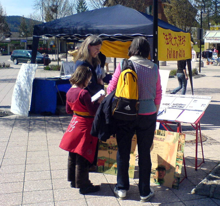 一位在此定居的大陆女士,指着“声援5千3百万勇士退出中共!”的横幅说,自己在欧洲定居了,和共产党没关系了,已经远离中共了,不用退了。经学员讲真相后她明白了,最后请学员给自己起了一个吉利好听的名字,高高兴兴做了“三退”。