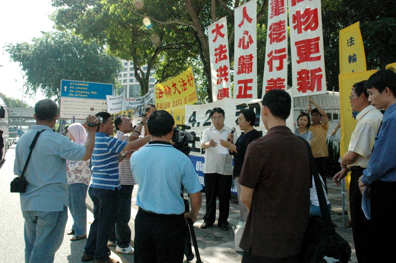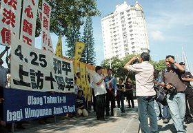 ![]() 马来西亚法轮功学员在中领馆前举办纪念“四•二五”和平上访十周年活动,各界人士关注。 |