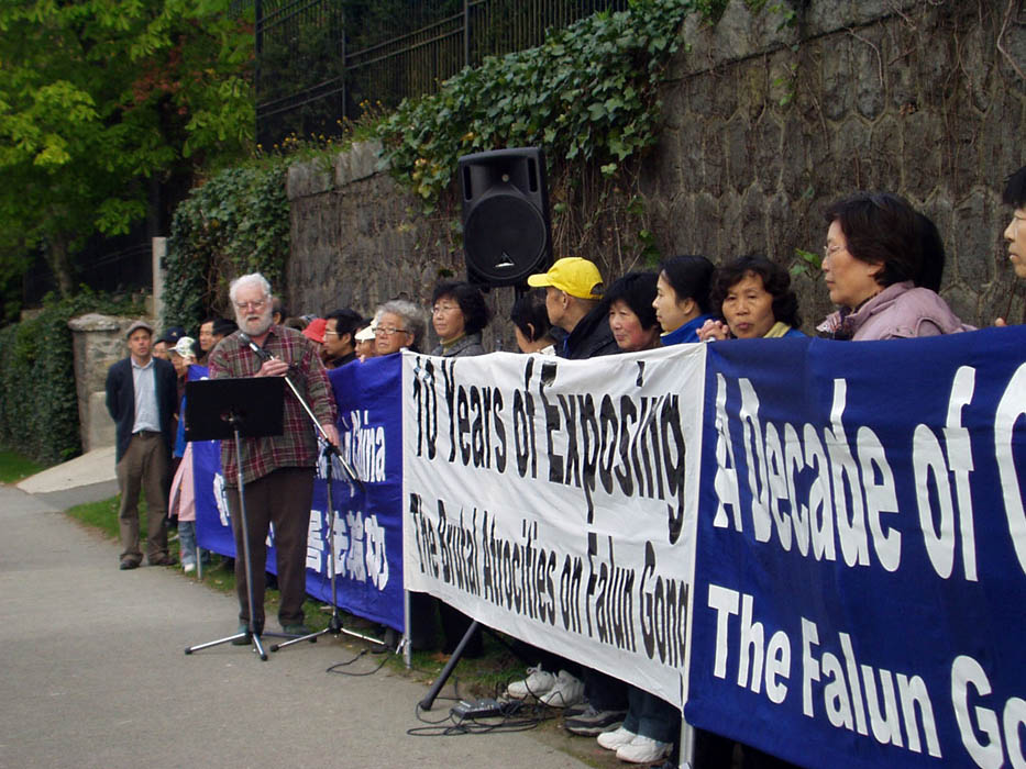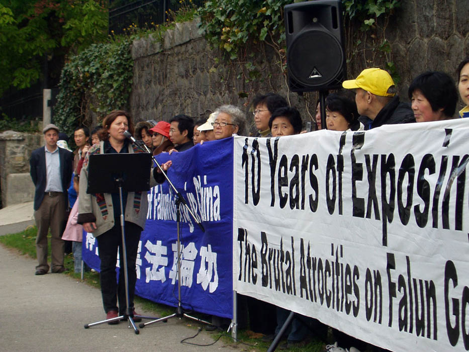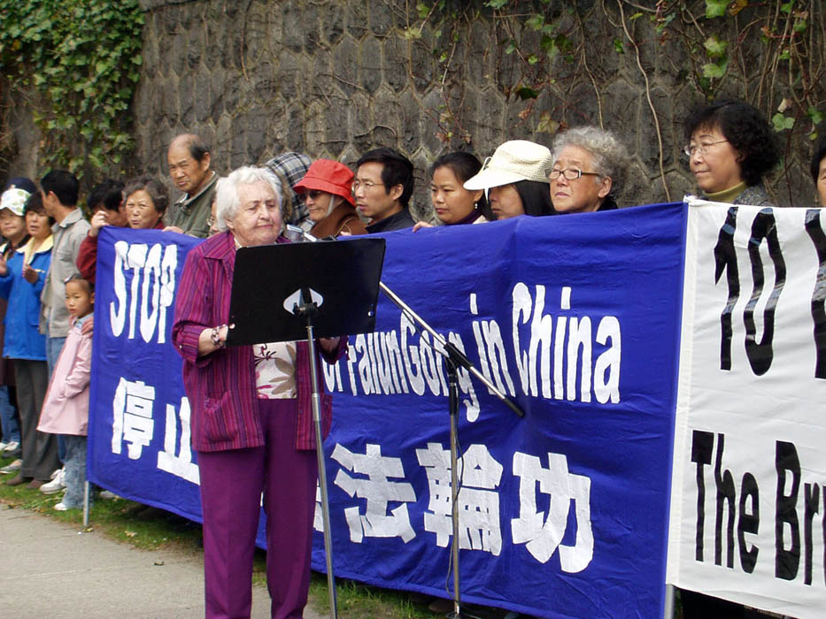 前国会议员、有三十年经验的资深记者西玛•郝特(Simma Holt)在集会发言说,法轮功受迫害已经十年了,为什么没有政府、媒体、机构站出来说话?她认为一个组织受迫害,实际上就是对所有人的迫害。她特别谴责前温哥华市政府用纳税人的钱打官司,无理要法轮功拆除在中领馆前的抗议点。
