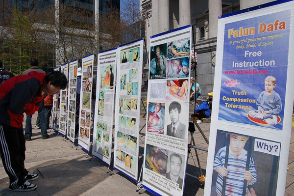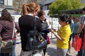 四月二十六日,法轮功学员在温哥华市中心艺术馆前举办真相图片展和征签、讲真相活动,让更多的世人了解在中国已经持续十年的这场迫害,尤其是活摘法轮功学员器官牟利的罪行。