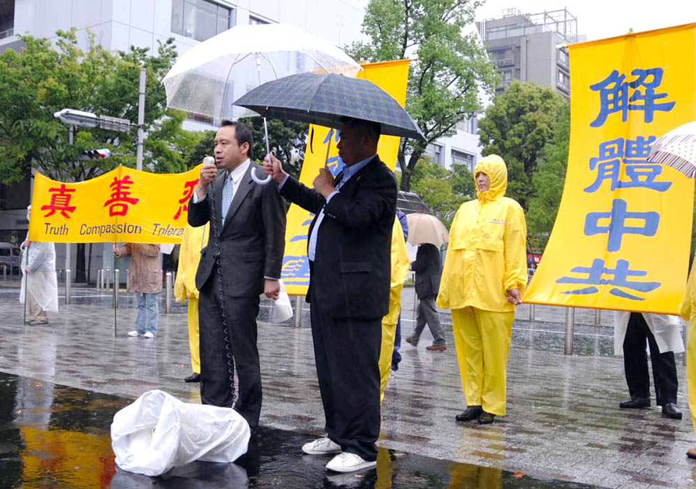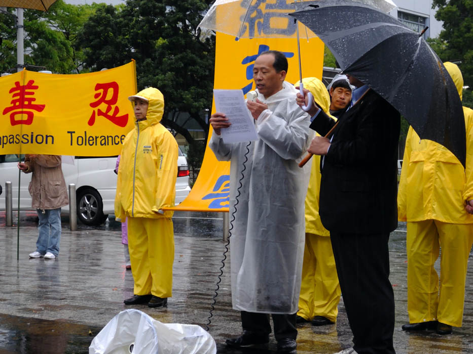 二十五日,日本全国普遍降雨,横滨从早上就在下雨,到中午时雨依然下得很大。在天国乐团激昂的演奏之后,法轮功学员开始在雨中集会。日本法轮大法学会王女士向与会者介绍了十年前四•二五和平上访的情况及中共对法轮功持续十年的残酷迫害,呼吁人们了解真相,早日结束迫害。