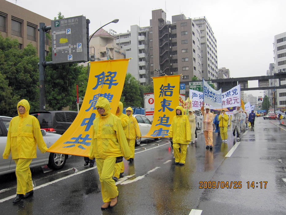 ![]() 法轮功学员冒雨在横滨游行,纪念四•二五和平上访,谴责中共迫害 |