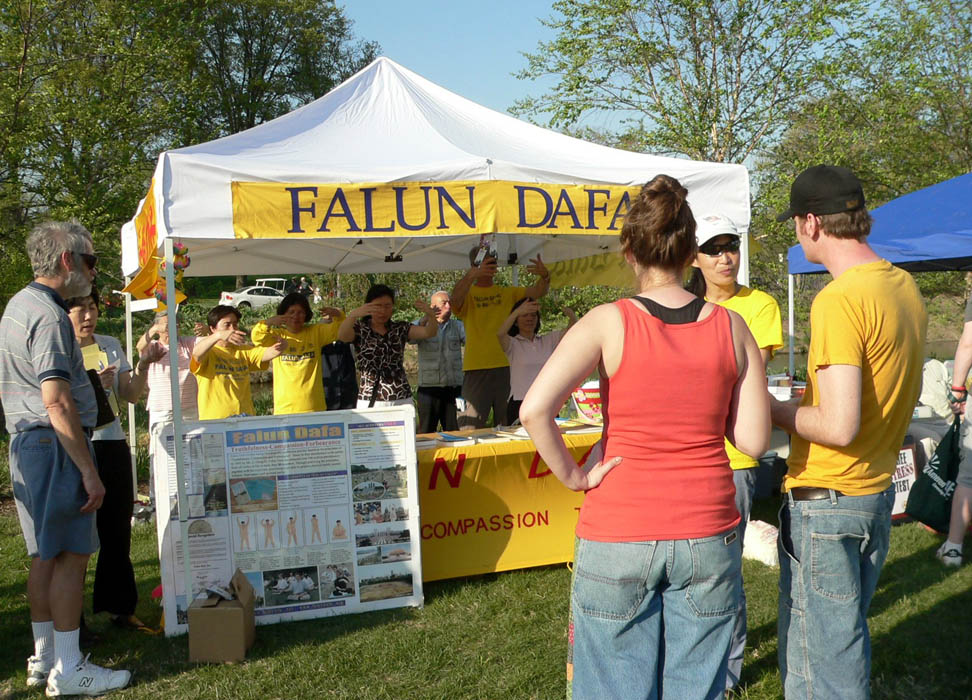 在法轮功展位前停留的人非常多,有要求学功的,有想了解迫害真相的。身材高大的非裔美国人拉尔夫(Ralph)兴奋地来到展位前,他告诉学员,自己曾炼过法轮功。他在网上找到《转法轮》,并跟着教功录像学功法,自己炼了一年多。因为没有找到炼功点,这几个月没有坚持。今天,他一眼看到金黄色的“法轮大法好”横幅,就异常的高兴。他兴奋地描述自己炼法轮功的感受:“我刚一开始炼功,身体就往上冲,太神奇了!”学员告诉他,在这个森林公园有一个法轮功炼功点,他连连说,太好了。