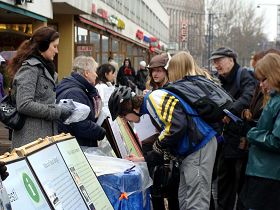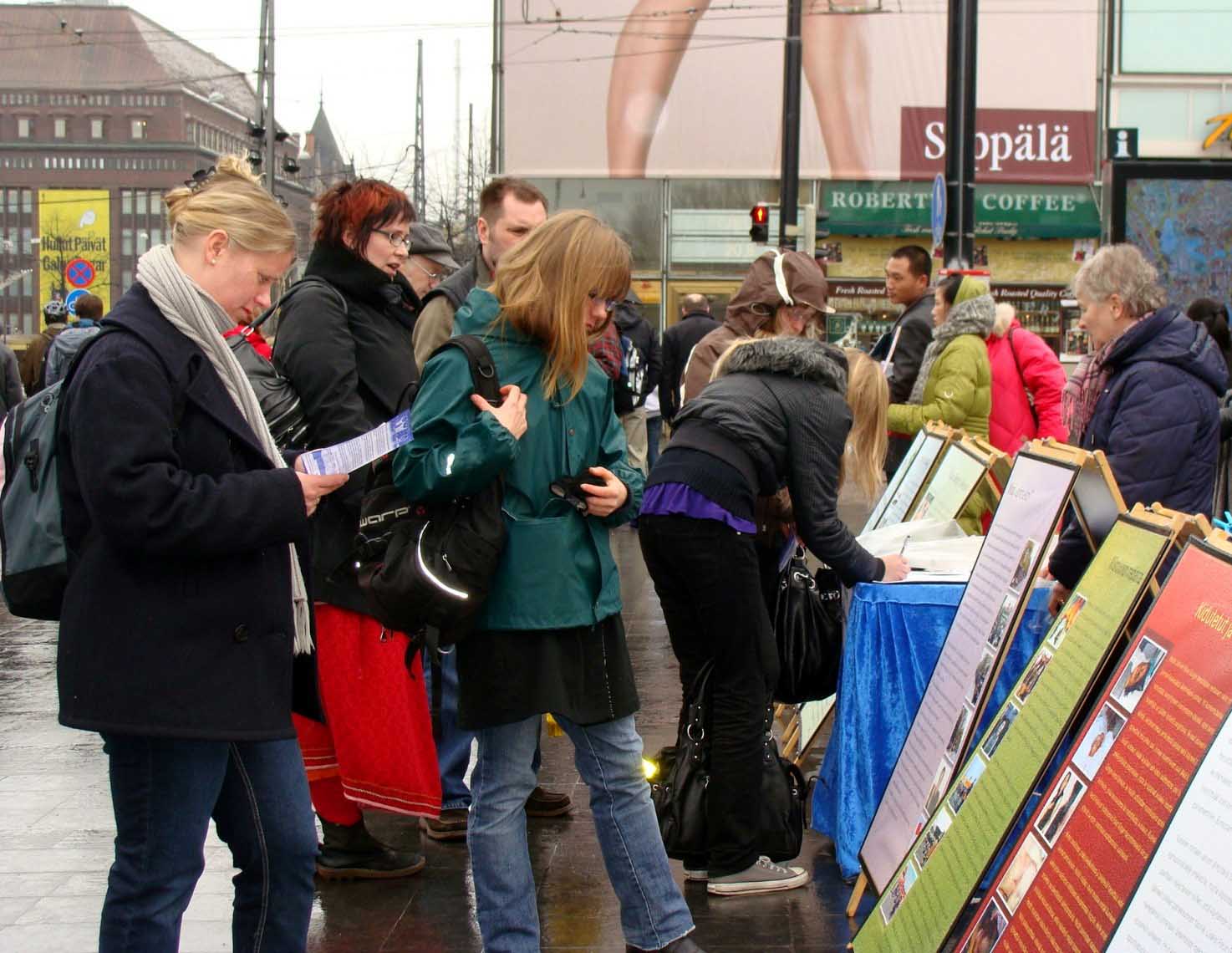 一位男士跟学员讲,他了解共产党的历史中有很多的残酷迫害。他很早以前就签过名了,他问除了签名还能做些什么来帮助法轮功学员。他表示人们需要去做些什么,而不应该对共产党太乐观。他还说,在芬兰经常能够看到不同的团体活动,他说:“你们做得特别好,很平和。”