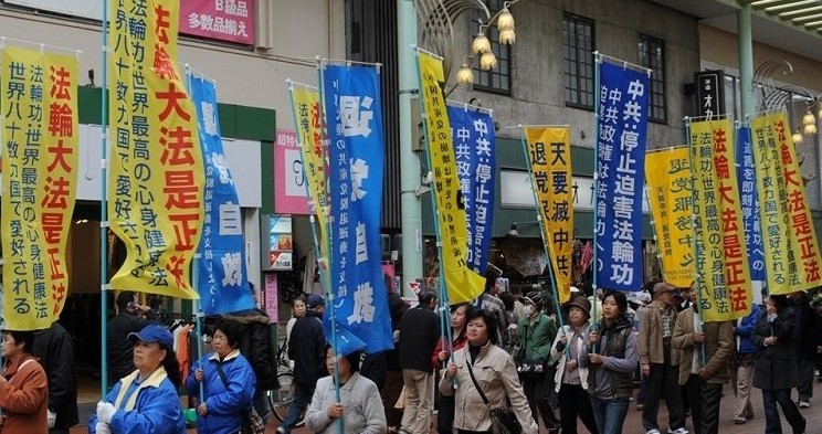 集会结束后,游行队伍穿过了神户繁华的商店街区,向当地民众揭露了共产党给中国民众带来的灾难,包括过去十年中对信仰“真善忍”的法轮功学员的残酷迫害,并展示了在中国发生的退党大潮的盛况。