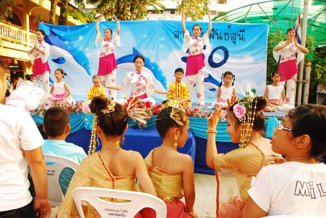 ![]() 二零零八年四月二十六日,泰国法轮功学员到曼谷Tanintornwittaya幼儿及少儿学校给教师洪法教功 |
