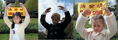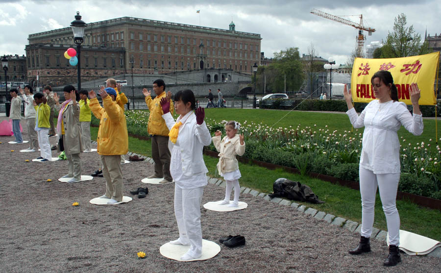五月九日上午十一点过后,刚刚下过一场小雨,天气凉爽,空气很新鲜。斯德哥尔摩市中心国王花园的很多游客被法轮功(又称法轮大法)优美的炼功音乐,学员宁静祥和的炼功场面,以及法轮大法洪扬全世界、法轮功学员在中国无辜遭到残酷迫害的真相展板所吸引,不少行人都驻足观看,并主动上前和法轮功学员交谈。还有的人对功法很感兴趣,当场就要学功。