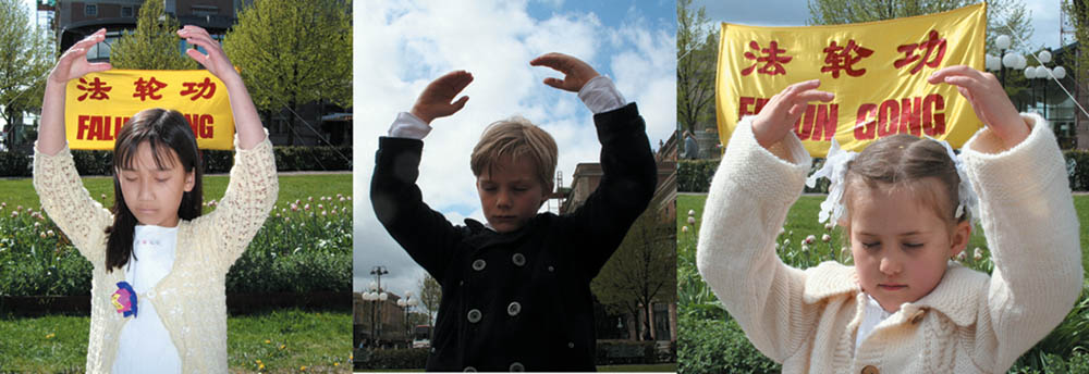 ![]() 法轮功学员在演示五套功法 |