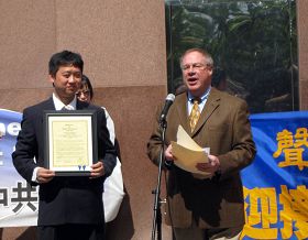 随后,柯林斯议员还代表市议会对本次活动颁发了褒奖,赞扬并支持五千四百万退出中共的中国民众。褒奖中说:“这辆卡车所经过的城市以及本次集会,都给那些直接或不直接遭受中共迫害的中国民众一个觉醒的机会,并替那些没有机会表达自己意愿的中国民众,比如法轮功群体,表达了一个有力的声音。”