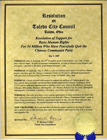 俄亥俄州特来多市议会颁发褒奖支持中国民众退出中共