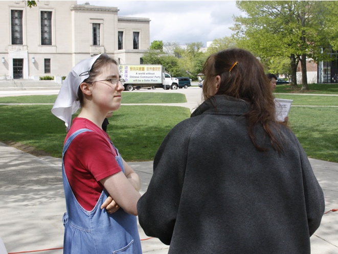 【明慧网二零零九年五月十一日】(明慧记者徐菁底特律综合报道)为期一周的“退党传播真相之旅”于二零零九年五月二日在芝加哥南华埠启程后,这辆贴有“天灭中共”、“迎接没有共产党的新中国”等标语的二十四英尺大型货车途经了威斯康星州的密尔瓦基、麦迪逊市,明尼苏达州的双子城,爱荷华州的得梅因,堪萨斯州的堪萨斯城,密苏里州的圣路易,伊州州府春田市,伊州香槟市,印第安纳州的印第安纳普勒斯,俄亥俄州的辛辛那提市、哥伦布市、克里夫兰市、特来多市,于五月九日最后抵达密西根州的底特律市,并在密西根大学安娜堡主校园内举行游行集会。值此,跨越美国中部九个州,十四个大城市,共二千五百英里的“退党传播真相之旅”圆满结束。