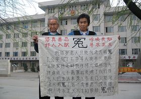 黑龙江省海林市大法弟子闫凤梅70多岁的婆婆(右)和金总善95岁的姥姥(左)在为闫凤梅和金总善喊冤。 |