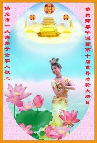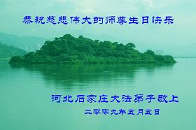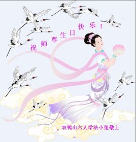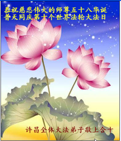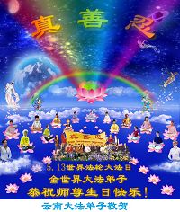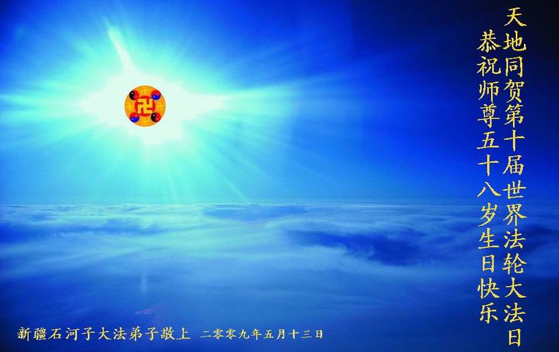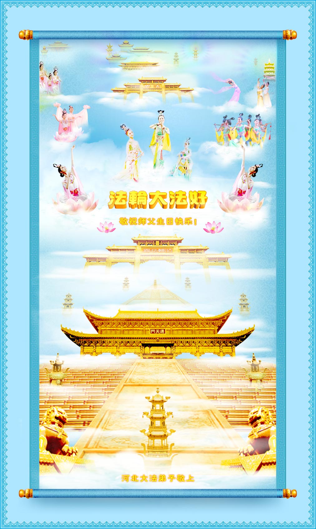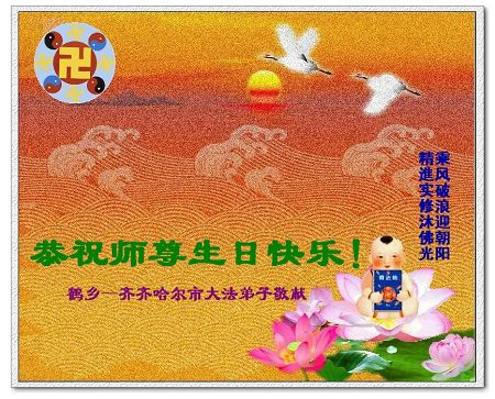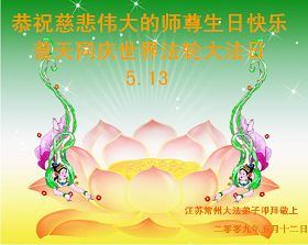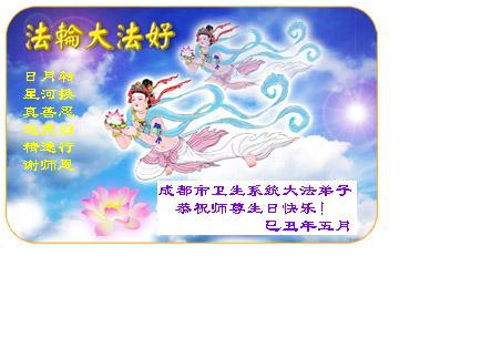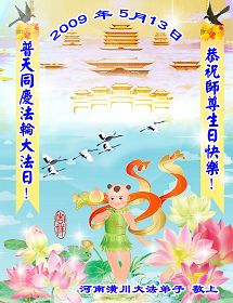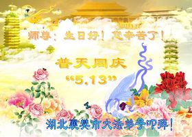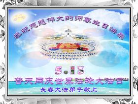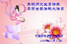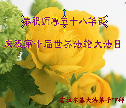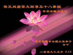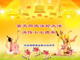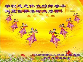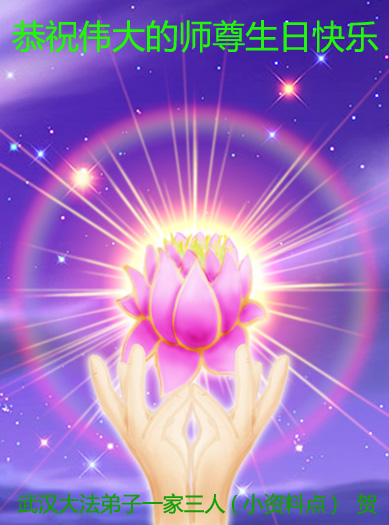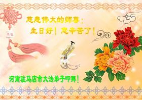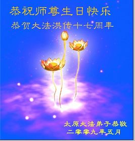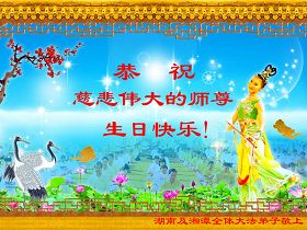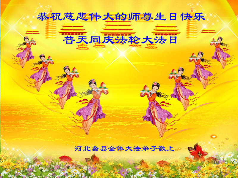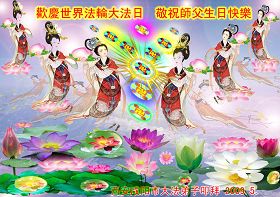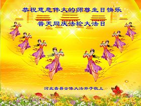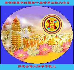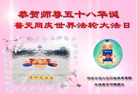 河南省某司法局的大法弟子恭贺世界法轮大法日!祝师父生日快乐!我们亲眼目睹了大法的神奇,受到师尊的呵护和慈悲救度。师父的恩泽,洪大的慈悲,用尽人类最美的语言都难以表达和赞美。在这人神共存,新旧宇宙交替的时刻,我们更加珍惜这稍纵即逝的时机,抓紧救度众生,灭尽最后的邪恶,圆满随师还!