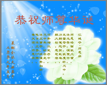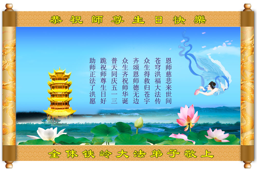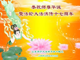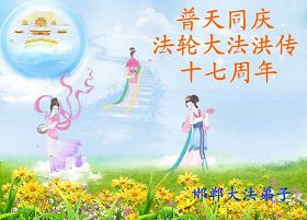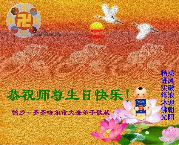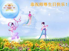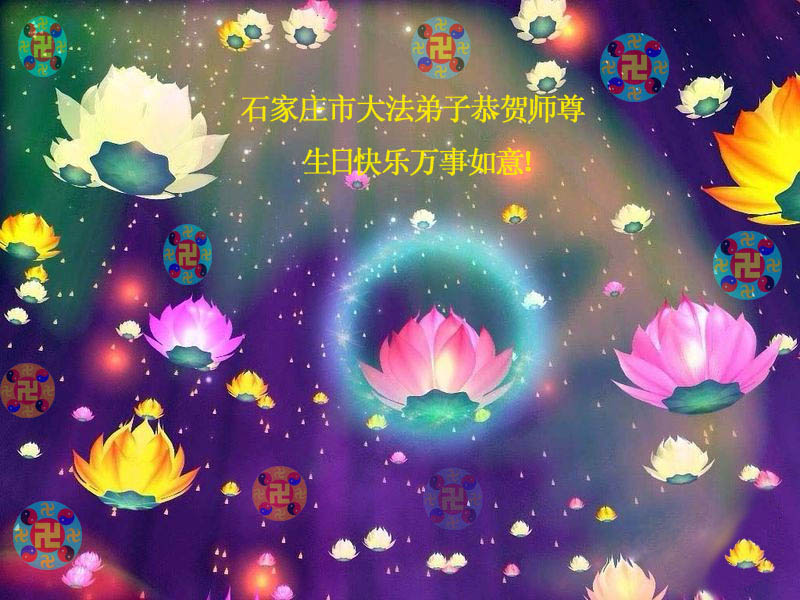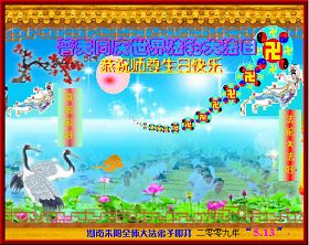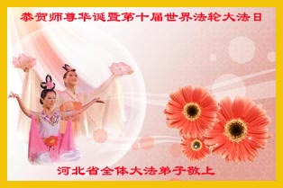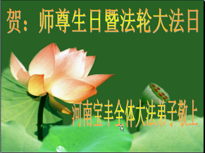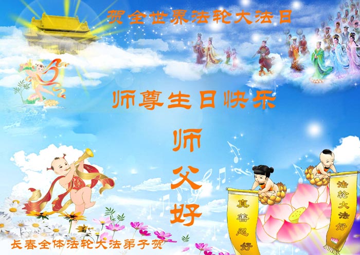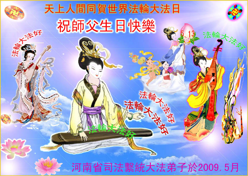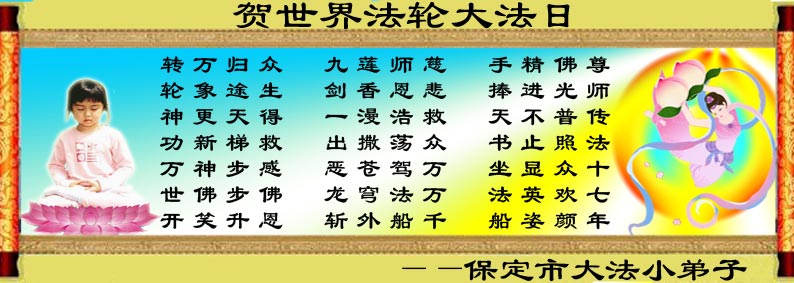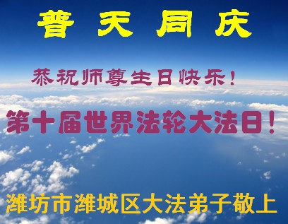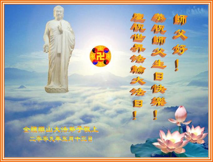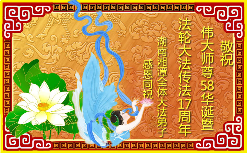 河南省某司法局的大法弟子恭贺世界法轮大法日!祝师父生日快乐!我们亲眼目睹了大法的神奇,受到师尊的呵护和慈悲救度。师父的恩泽,洪大的慈悲,用尽人类最美的语言都难以表达和赞美。在这人神共存,新旧宇宙交替的时刻,我们更加珍惜这稍纵即逝的时机,抓紧救度众生,灭尽最后的邪恶,圆满随师还!