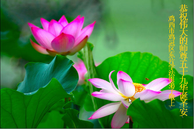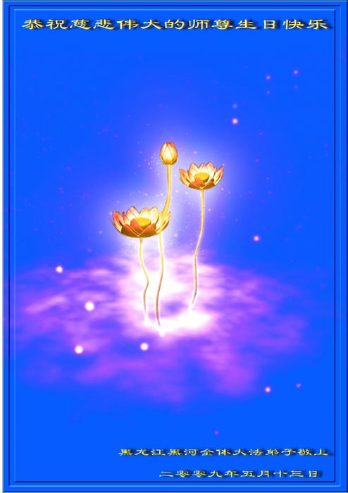 慈悲伟大的师尊您好!我们不管身在何处,不管在什么环境中,也不管在什么形势下,都坚信师父、坚信大法,修好自己,同化大法,理智、认真的做好三件事,使众生得救,回归新宇。