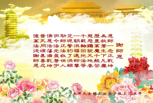 千言万语万语千言汇成一句话:坚信师父坚信大法坚如磐石。无论环境千变万化,心中只存唯一一念:听师父的话,做师父的真修弟子。师父您就放心吧!您的弟子们携全家及明白真相的亲戚、朋友、同事、邻居向伟大慈悲的师父跪拜:再谢恩师慈悲救度!
